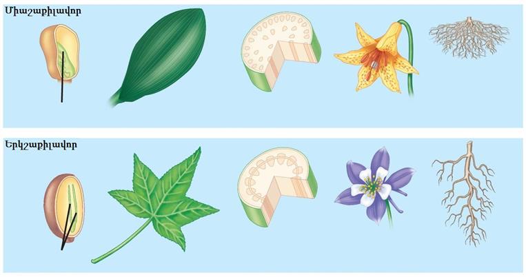1 . Միաշաքիլավոր բույսերի դաս. պատկանում են՝ լոբին, ոլոռը, կաղամբը, արևածաղիկը, խնձորենին, ելակը: