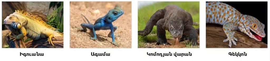 Ներկայացուցիչներն են՝ իգուանա, ագամա, կոմոդյան վարան, գեկկոն: