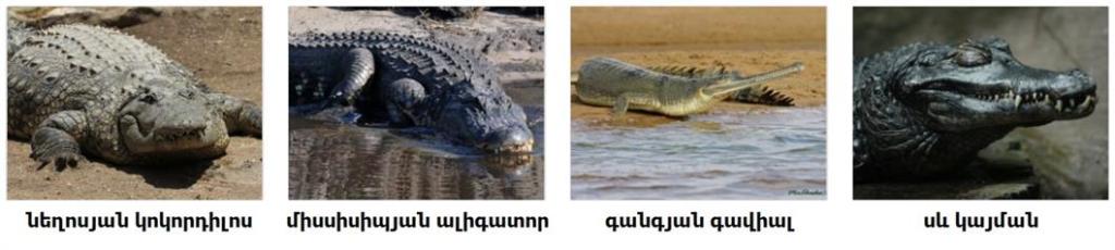 Ներկայացուցիչներն են՝ նեղոսյան կոկորդիլոս, միսսիսպյան ալիգատոր, գանգյան գավիալ, սև կայման: